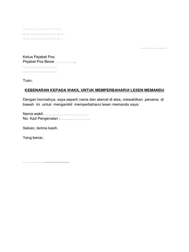 Share surat kebenaran bawa kenderaan. Surat Kebenaran Wakil d2nvj6d9xonk. Surat wakil merupakan kebenaran dan pengesahan daripada pemilik dokumen yang mewakilkan seseorang untuk menguruskan atau mengambil dokumen yang.